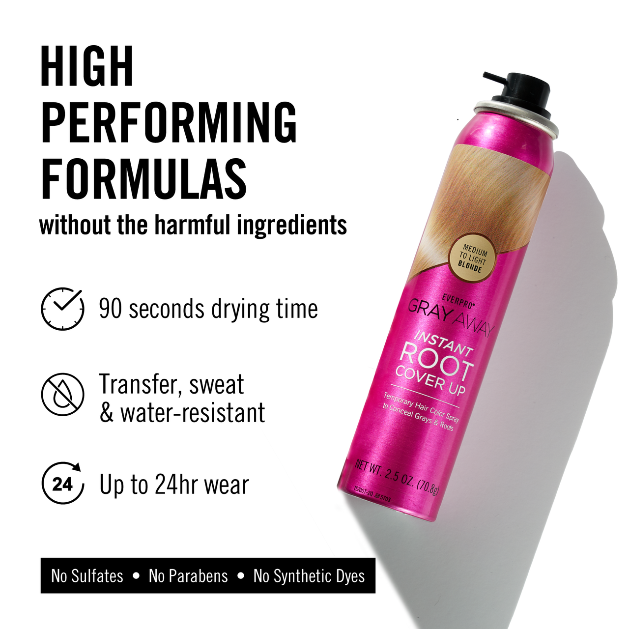 - Spray blends seamlessly into hair and diffuses harsh root lines